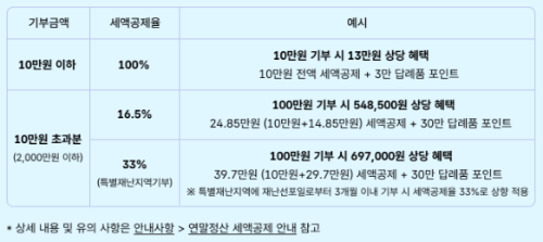 → 10만원 기부시 10만원은 세액공제로 돌려받고, 3만원 상당의 답례품을 받을 수 있음