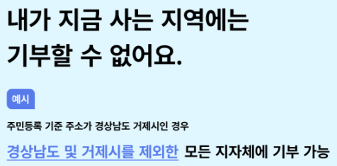예) 경기도 성남시민은 경기도와 성남시를 제외한 전국 모든 지자체에 기부 가능(화성시, 용인시, 서울특별시...)