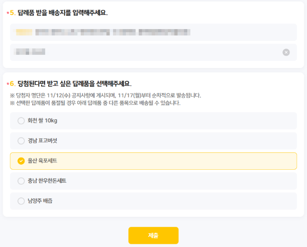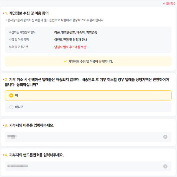 동의하는 내용, 기부자의 이름, 핸드폰번호, 배송지를 입력하고, 당첨시 받고 싶은 답례품을 선택하면 됩니다. 제출 버튼을 누르면 네이버폼으로 작성되었음을 확인할 수 있습니다.