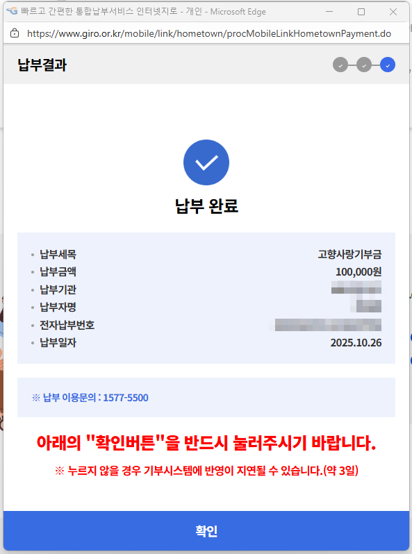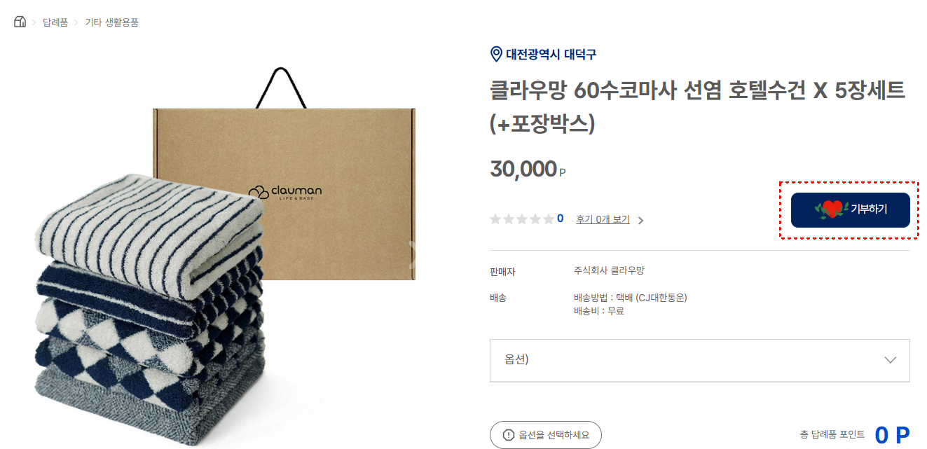 납부완료가 되는 동시에 마이페이지에는 기부포인트가 30%인 3만p가 적립됩니다.(3만원 상당)