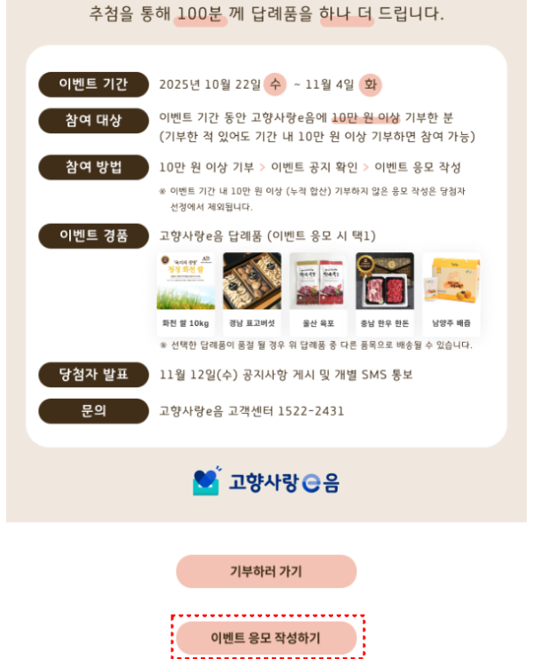 '25.10.22 ~ 11.4까지 10만원이상을 기부한 분들은 100명을 추첨하여 이벤트 경품을 추가로 받을 수 있는 이벤트도 진행하고 있으니, 고향사랑기부제에 참여하실 계획이셨다면, 이벤트 기간에 참여해 보시기 바랍니다.