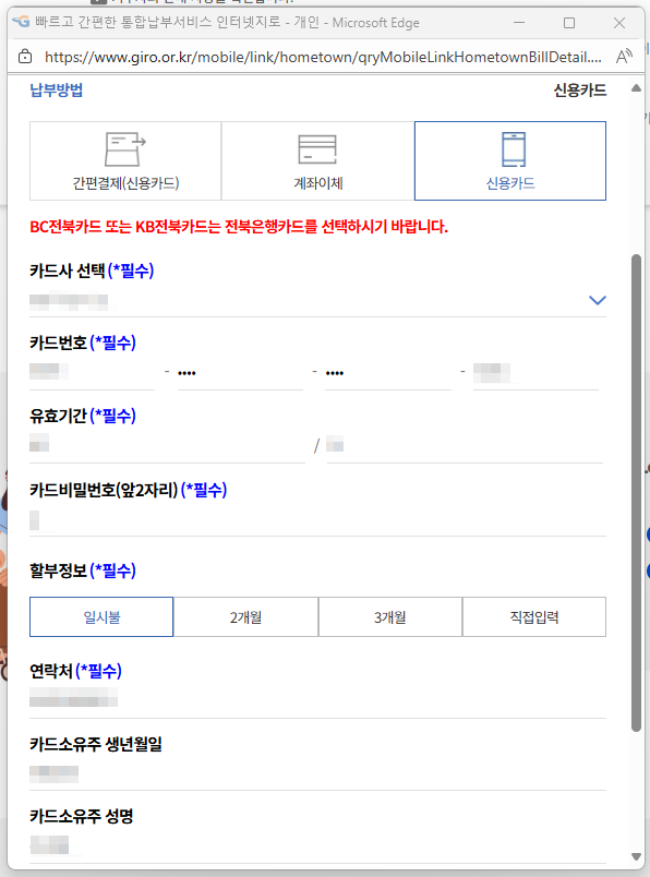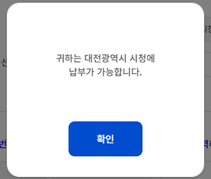 모든 정보를 입력하면, 부과정보가 등록 완료되었다는 팝업이 뜨며, 다음을 누르면 납부방법을 선택하여 납부하게 됩니다. 간편결제, 계좌이체, 신용카드 납부 3가지 방법이 가능합니다. 간편결제는 페이코(PAYCO), 카카오페이, 네이버페이 3가지만 가능합니다. 카드결제를 선택하면, 아래와 같이 카드번호, 유효기간, 비밀번호 앞자리 등을 입력하여 납부할 수 있습니다. (삼성페이 불가)