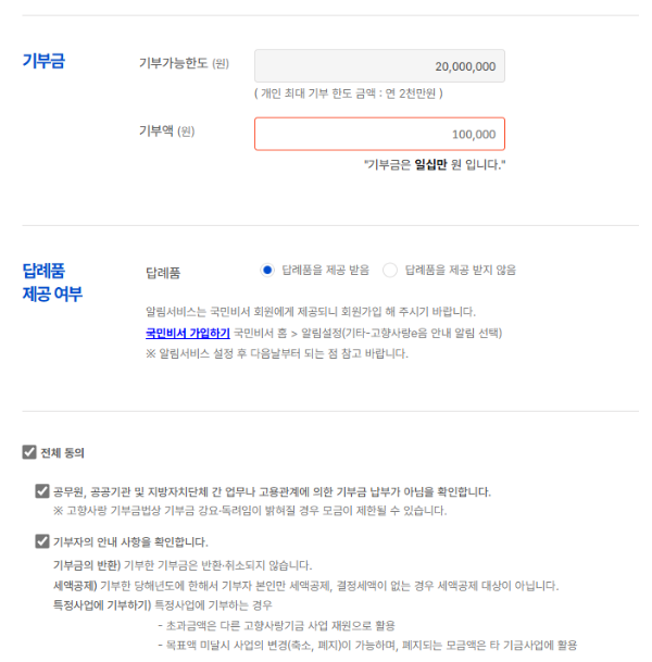 기부금액을 입력하시고, 답례품 제공받음을 선택하신 후 확인사항에 체크하시고 기부금납부하기 버튼을 누르면 됩니다.