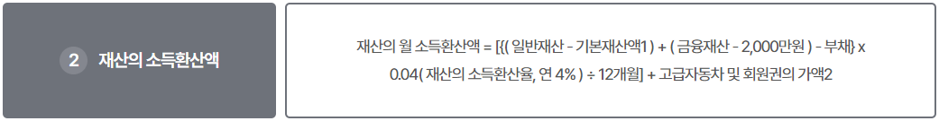 소득인정액 = ①소득평가액 + ②재산의 소득환산액 |