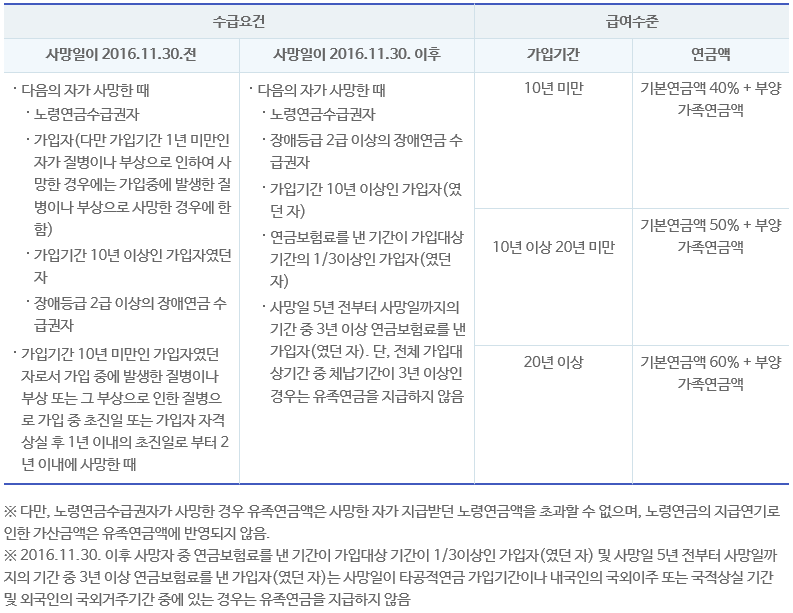 ※ 유족연금 : 기본연금액의 40~60%(가입기간에 따라)