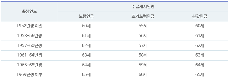 → 1969년생 이후 출생자 : 노령연금은 65세부터 받을 수 있으며, 조기노령연금은 60세부터 수령 가능합니다.