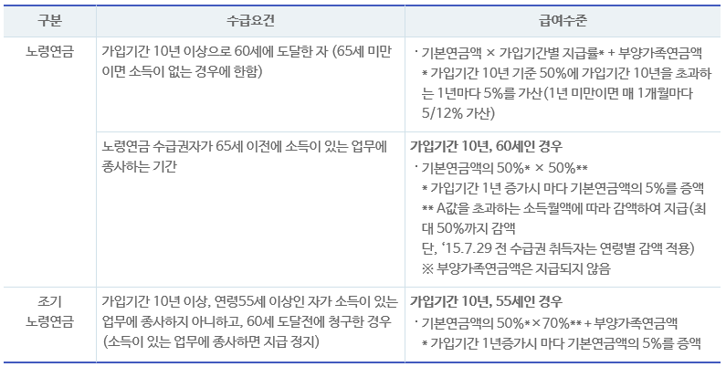 - 노령연금 : 국민연금의 기초가 되는 급여로 국민연금 가입자가 나이가 들어 소득활동에 종사하지 못할 경우 생활안정과 복지증진을 위하여 지급되는 급여로써 가입기간(연금보험료 납부기간)이 10년 이상이면 아래 개시 연령부터 평생 동안 매월 지급받을 수 있습니다.