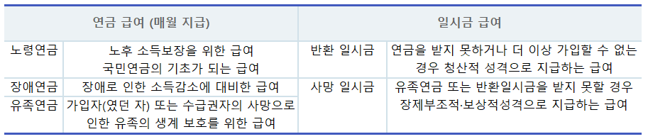 - 노령연금 외에도 장애, 유족연금도 있다.