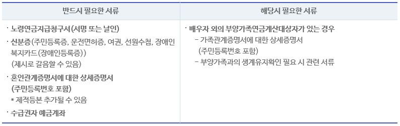 ※ 부양가족연금액 : 국민연금법 제52조에 의거, 수급권자에 의하여 생계를 유지하고 있는 자에 대하여 배우자 年 15만원, 19세 미만 자녀 年 10만원, 60세 이상의 부모 年 15만원 등 지급합니다. 노령연금 신청할 때 가족관계증명서 등 서류 제출하여 증빙합니다.