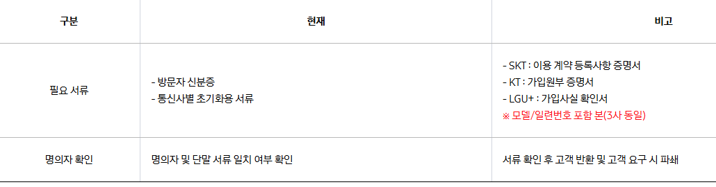 - 서류 : 초기화용 통신사별 발행서류, 주민등록등본, 방문자 신분증