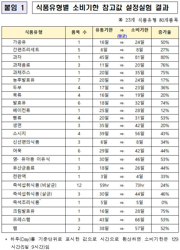 식약처에서는 소비기한 표시제도 시행에 앞서 23개 식품유형 80개 품목의 소비기한 참고값을 제시한 안내서를 배포했습니다. 소비기한 참고값은 식약처가 품목별로 소비기한 설정 실험을 수행한 결과에 따라 정한 잠정 소비기한입니다. 소비기한 설정 실험을 자체적으로 수행하기 어려운 영업자들이 별도의 실험을 수행하지 않고도 소비기한 참고값을 참고하여 활용할 수 있도록 제공된 자료입니다.