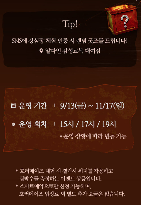 ※ 15시, 17시, 19시에는 추가 요금 없이, 갤럭시워치를 착용하고 강심장을 증명하면 랜덤 굿즈를 받으실 수 있습니다.