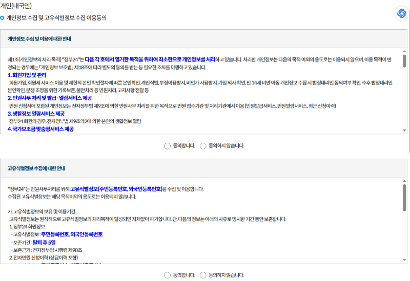 비회원으로 신청하면 다음과 같이 동의 절차와 본인 확인 절차를 거칩니다.