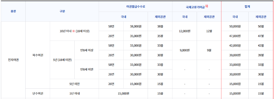 여권발급 수수료는 다음과 같습니다. 예를 들어, 복수여권 10년 58면으로 신청할 경우 수수료는 50,000이며, 부가수수료는 4%인 2,000원이 추가되어 총 52,000원을 납부하면 됩니다.