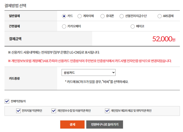 카드, 계좌이체, 휴대폰, 선불전자지급수단, ARS결제와 간편결제(카카오페이, 페이코) 등으로 다양하게 결제할 수 있습니다.