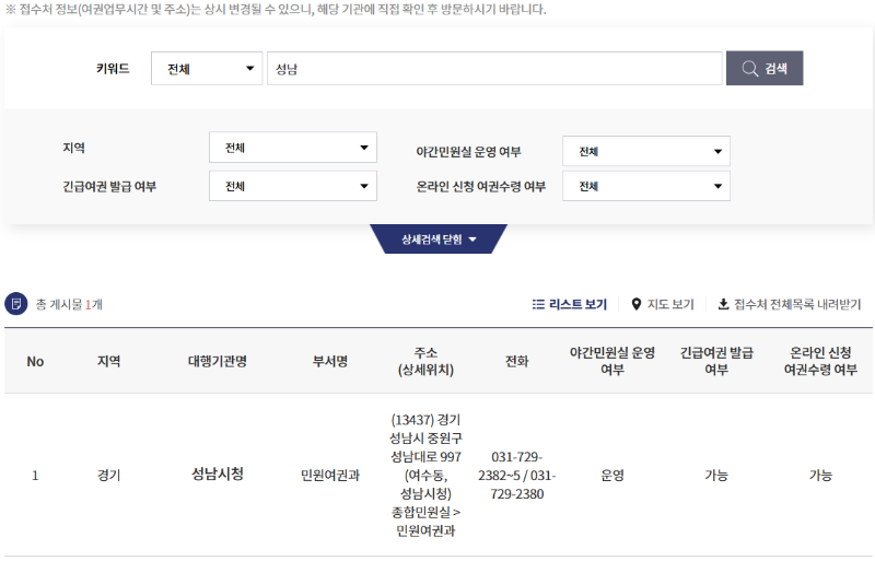 아래와 같이, 지역명을 검색해 보시면 자세하게 정보를 검색해 보실 수 있습니다. 야간민원실 운영 여부, 긴급여권 발급 여부, 온라인 신청 여권수령 여부 등도 표시되어 있습니다.