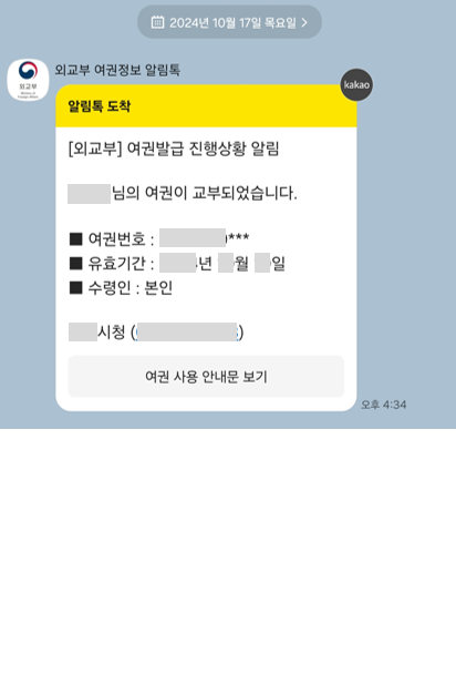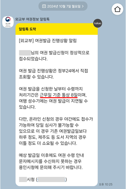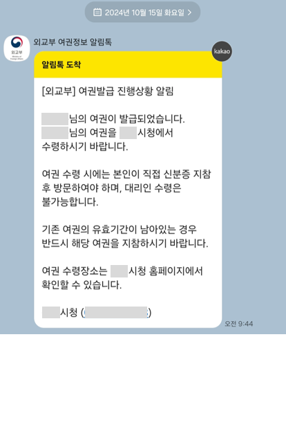 실제, '24.10.7(월) 밤에 신청하여 '24.10.15(화) 오전 09:44에 여권이 발급되었고 찾을 수 있다는 안내를 받았습니다. 접수일 다음 날부터 계산하면 근무일 기준 6일만에 발급이 된 것입니다. 여권을 수령하면 교부되었다는 알림톡 까지 보내줍니다.