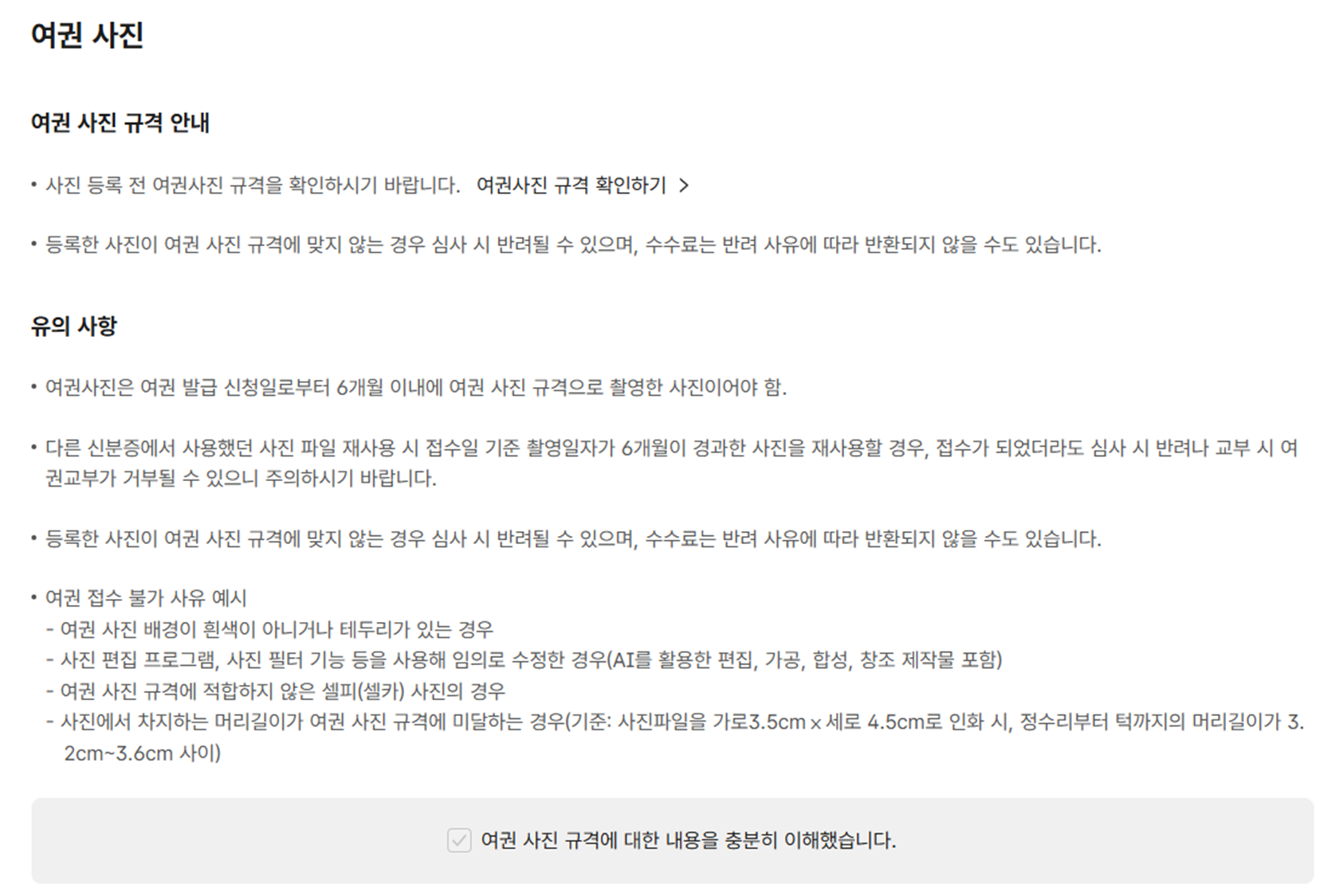 그리고, 마지막으로 사진을 업로드 해야 합니다. 여권 사진은 매우 중요합니다. 사진 때문에 여권신청 접수가 반려될 수도 있고, 수수료도 반려 사유에 따라 반환되지 않을 수도 있다고 합니다. (위에서 이러한 내용을 동의해야 접수가 진행됨)