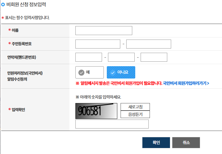 비회원이기 때문에 민원처리 정보 알림을 받기 위해서 국민비서 회원가입이 필요합니다. 국민비서는 자주 사용하는 앱을 통해서 필요한 행정정보 알림을 받을 수 있는 서비스입니다.