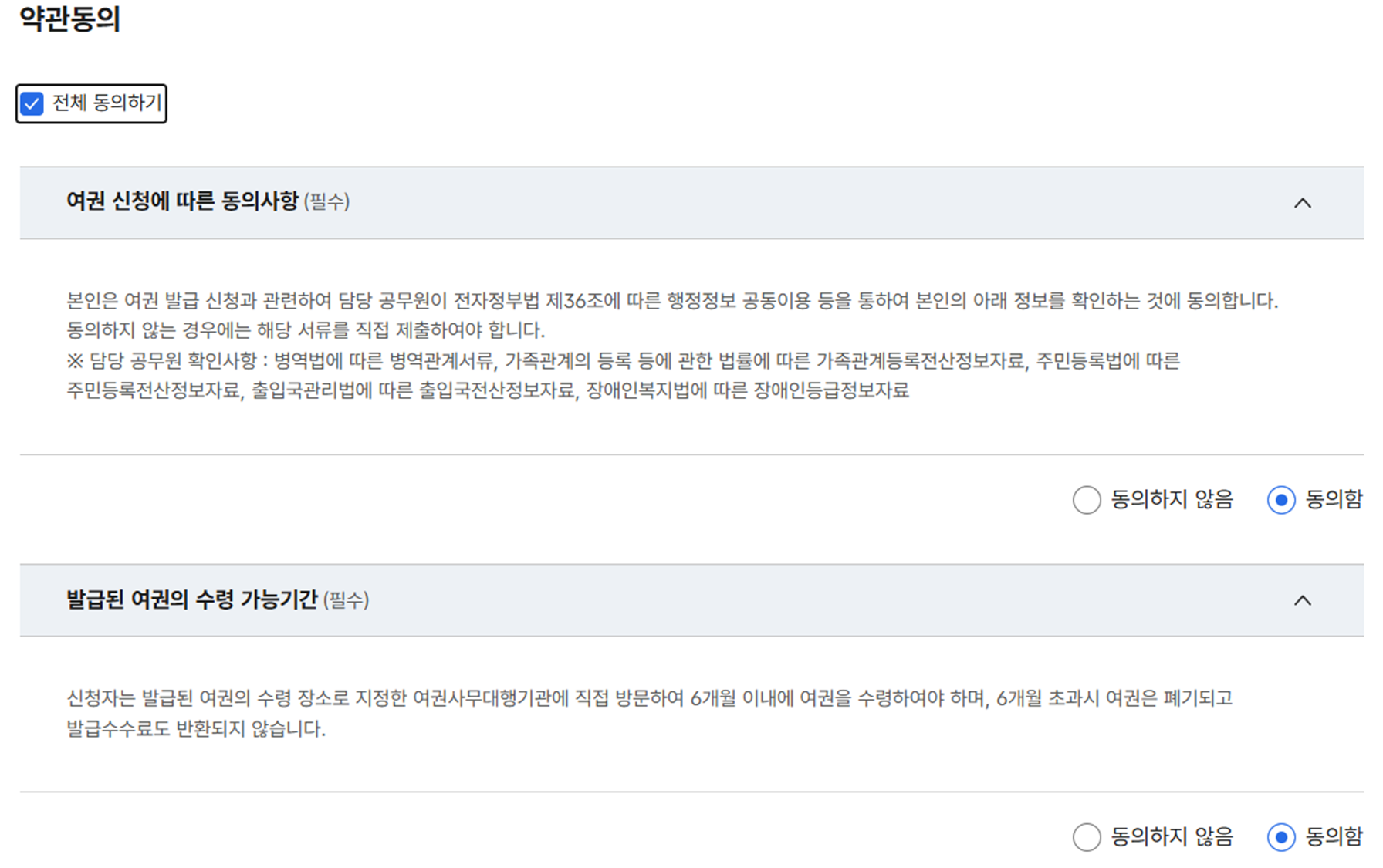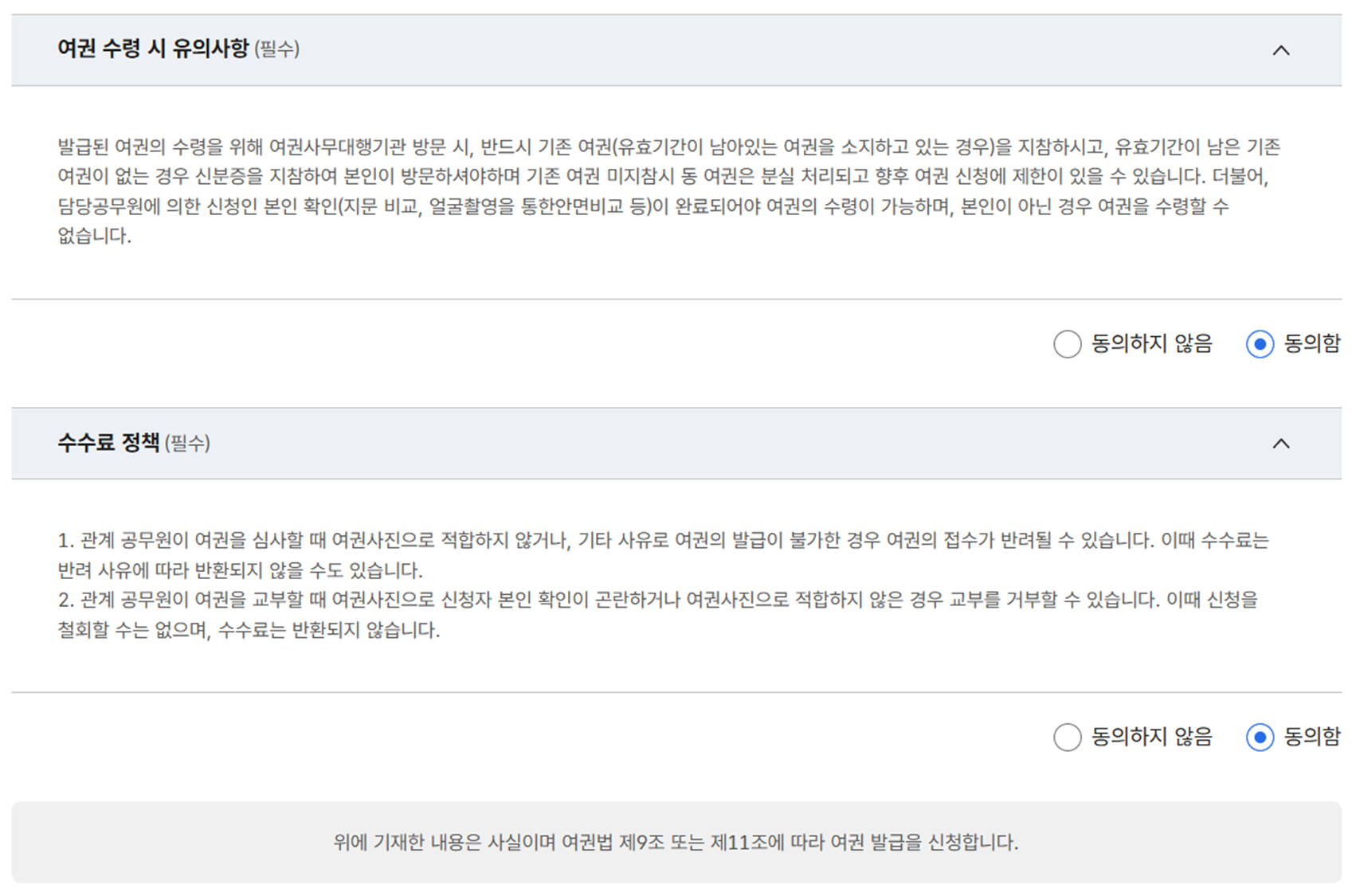 기본정보를 입력한 후에는 여권 신청에 따른 여러 동의 사항과 주의사항에 대하여 동의를 합니다.