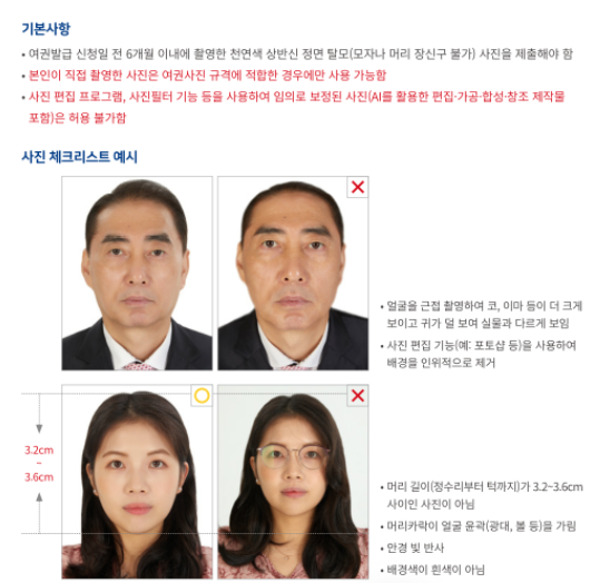 따라서, 여권 사진은 사진관에서 전문 사진사를 통해 촬영하시기 바랍니다. 너무 많이 편집하는 사진관도 있는데, 여권 신청할 때 반려되지 않도록 잘 인화해 달라고 요청하시기 바랍니다.