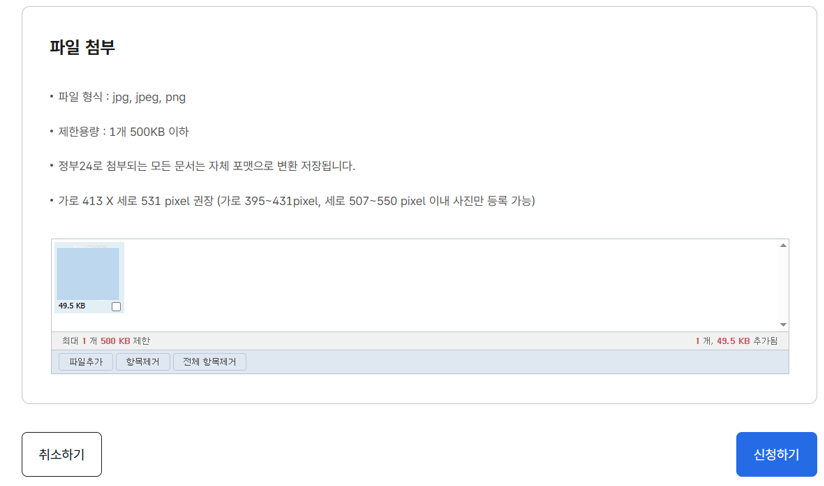 정부24에서 여권 온라인 재발급을 진행하면, 마지막 단계로 사진 파일을 첨부하게 되어 있습니다.