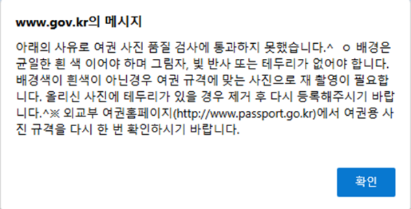 기본적으로 배경이 흰색이어야 하며, 일반적인 증명사진 보다는 얼굴의 크기도 더 크게 나와야 합니다. 첨부하는 사진이 배경이 흰색이 아니라고 인식이 되면 오른쪽과 같이 사진을 다시 첨부해야 합니다.