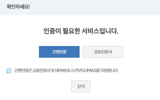 모두 입력하시면 인증화면이 나옵니다. 간편인증은 금융인증서 및 네이버/토스/카카오/PASS를 지원하고 있습니다.저는 네이버 인증서로 진행해 보았습니다.