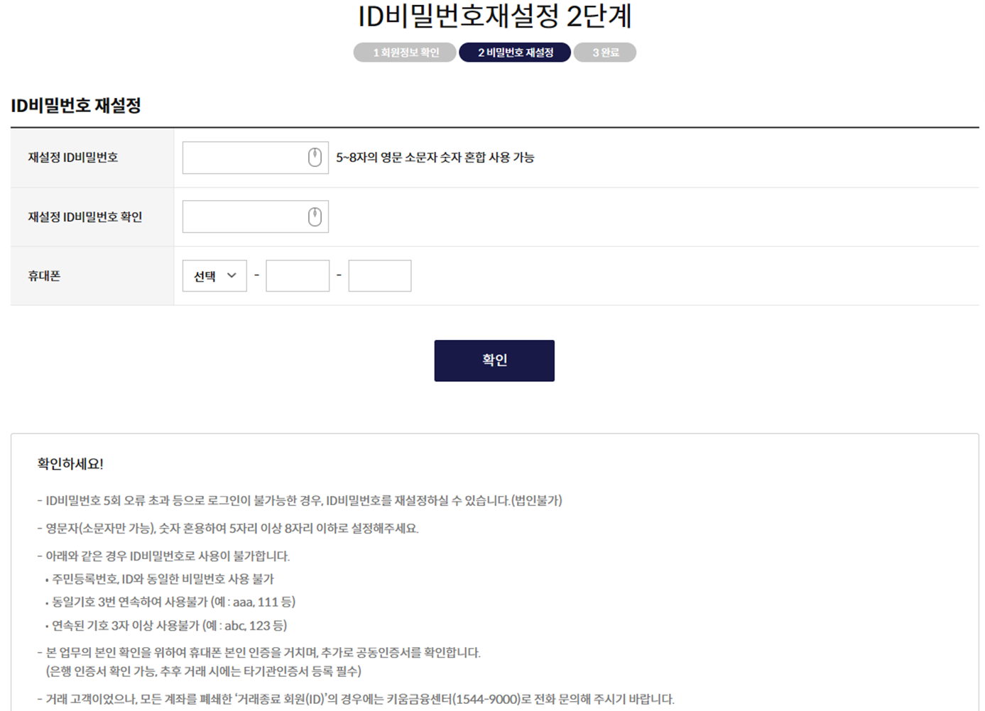 ID비밀번호는 5~8자 영문, 숫자 혼합이며, 계좌비밀번호는 4~8자 숫자입니다. 헷갈리지 않도록 잘 기억하시거나 메모해 두시길 추천드립니다. 그렇지 않고 시간이 지난다면... 다시 처음부터 반복하셔야 할 것 같습니다.