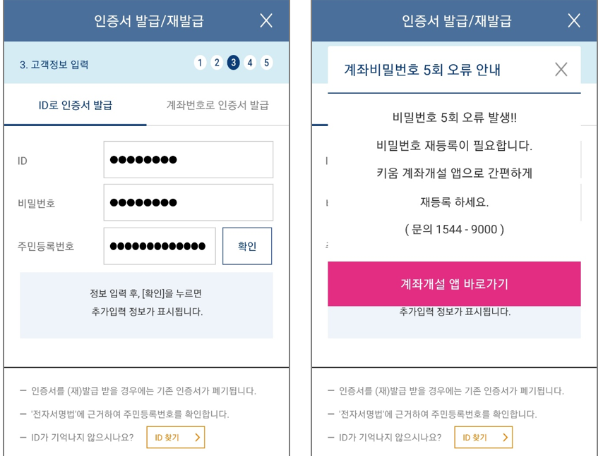 ID로 인증서 발급을 시도했으나, 계좌비밀번호를 재설정하지 않으면 불가함