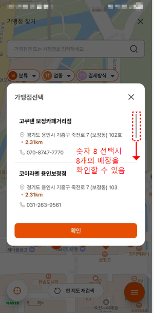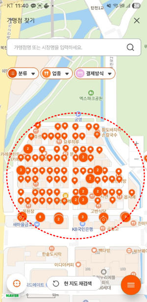 온누리상품권 앱의 중간에 있는 가맹점 찾기를 선택합니다. → 검색하고 싶은 지역으로 지도를 움직여서 아래 부분에 있는 "현지도 재검색" 버튼을 누르면 검색이 됩니다. → 숫자가 적혀 있는 곳을 클릭하면, 숫자 만큼의 가맹점 정보를 확인할 수 있습니다.