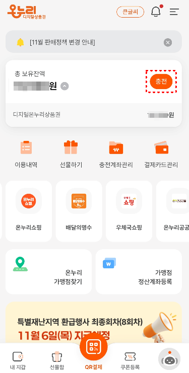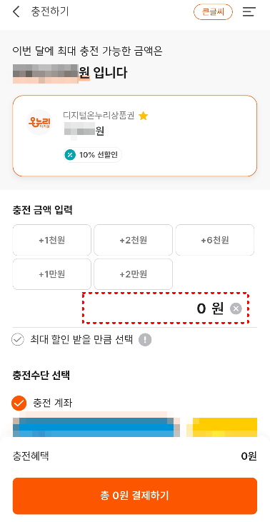 계좌를 연결한 다음, 카드를 등록한 후에는 온누리상품권을 충전해야 합니다. 충전된 금액이 결제할 금액보다 더 커야만 온누리상품권으로 결제할 수 있기 때문입니다.