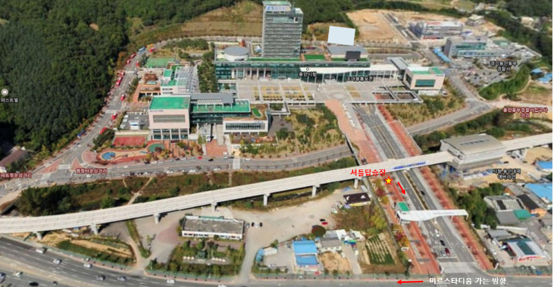 용인시청 보다는 미르스타디움에서 조금 멀지만, 셔틀버스를 운행하는 임시주차장이 바로 명지대 임시주차장입니다. 셔틀버스로 경기장까지 약 20분 정도 소요된다고 안내하고 있습니다.