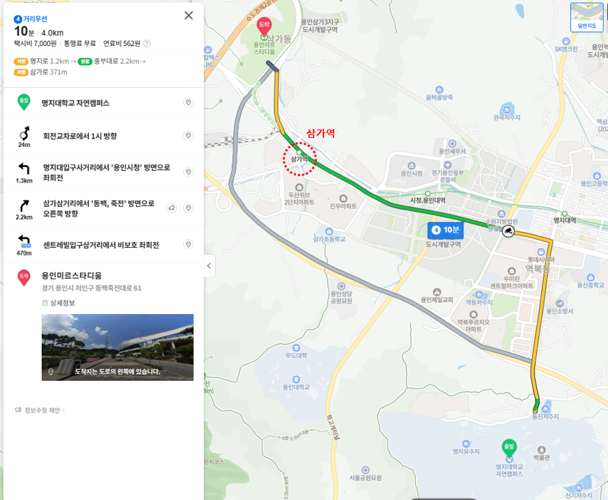 명지대학교 입구에서 용인미르스타디움을 자동차로 네이버 길찾기 해보면, 10분 4km로 검색됩니다. 삼가역을 지나는 노선으로 운행할 것 같습니다.