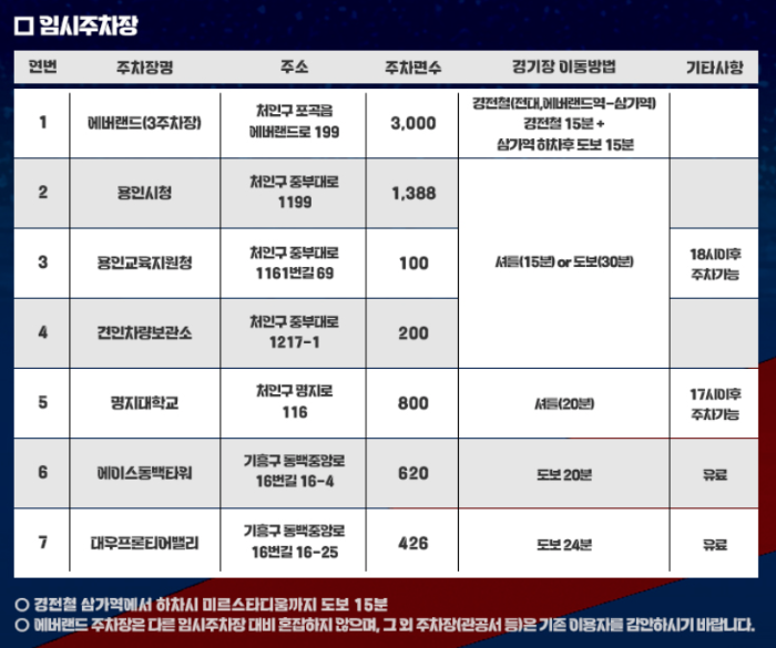 에버랜드 3주차장, 용인시청, 명지대학교, 에이스동백타워 등에 주차공간을 마련했습니다. 이 중에서 가장 추천드리는 임시주차장은 셔틀버스가 운영되는 용인시청 주차장과 명지대학교 주차장입니다.
