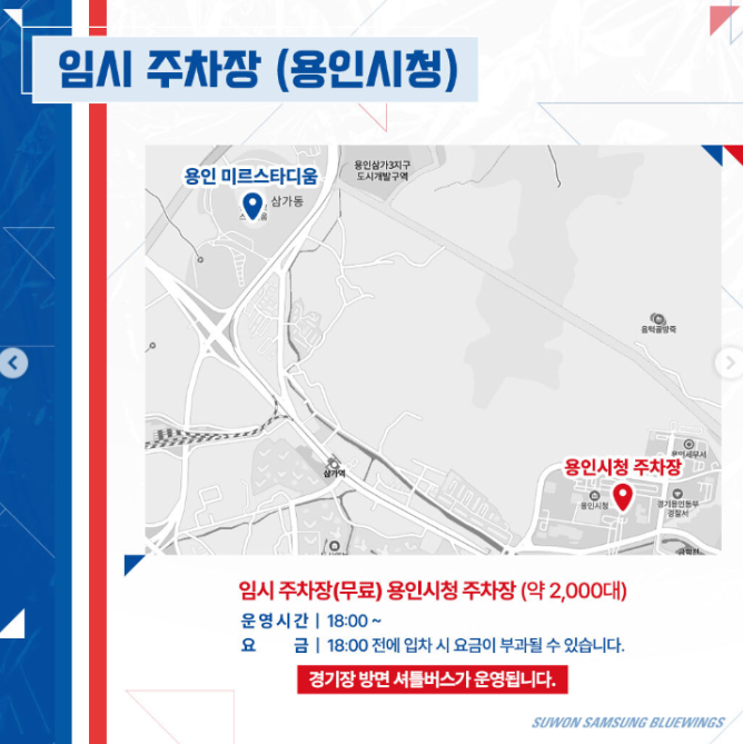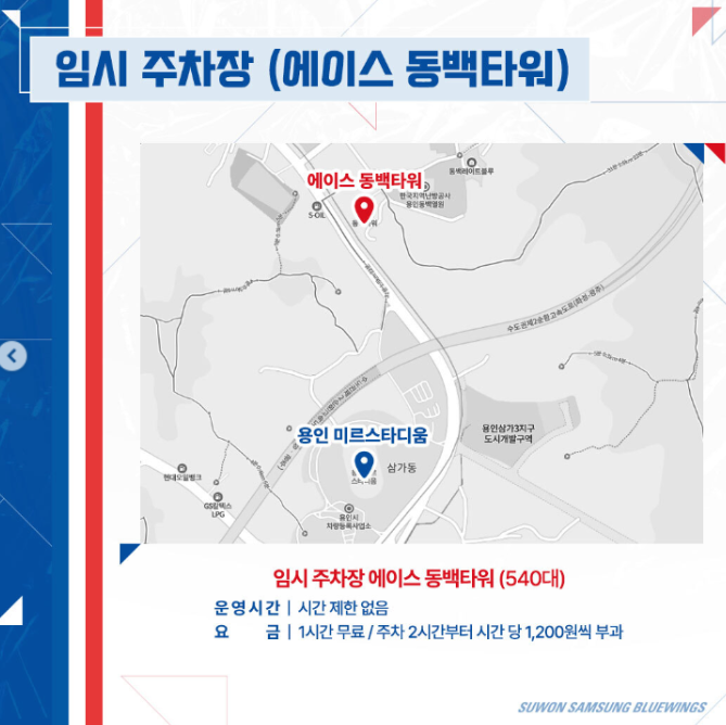 수원삼성블루윙즈 경기가 있을 때, 용인시청과 에이스 동백타워에 무료 주차장을 운영합니다. 이번 이라크전에는 추가로 임시주차장을 운영할 예정입니다.