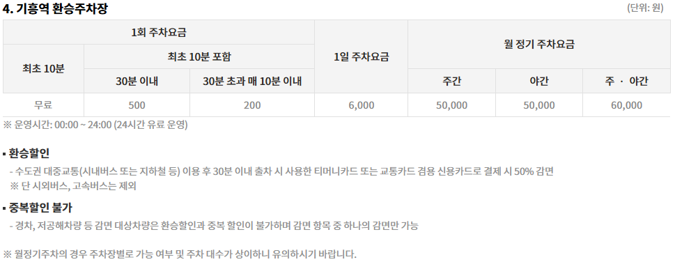 기흥역환승주차장은 24시간 유료운영되며, 주차료는 아래와 같이 저렴합니다. 기흥역환승주차장에서 경전철을 타고 이동할 경우, 약 40분 가까이 소요된다는 점 참고하시기 바랍니다.