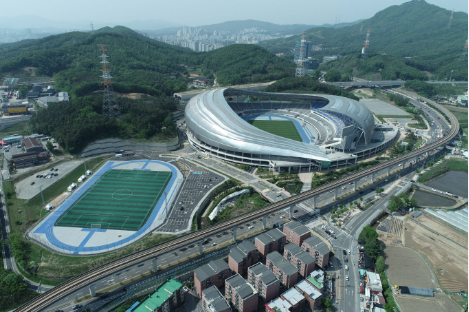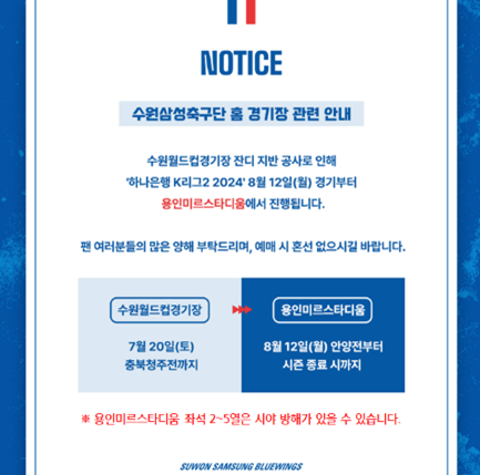 수원월드컵경기장 잔디공사가 있기 때문에, 용인 미르스타디움을 현재 수원삼성블루윙즈에서 임시로 홈구장으로 이용하고 있습니다. 축구전용 구장은 아닙니다.
