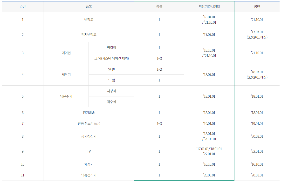 ↓ 아래 11개 품목 중, 에어컨, 세탁기, 진공 청소기(유선)를 제외한 8개 품목은 1등급이 대상이며, 세탁기(일반)은 2등급, 에어컨(벽걸이를 제외), 진공 청소기(유선)은 3등급까지 지원대상입니다. 현재 기준이며 추후 한국에너지공단에서 등급기준 변경시 다시 공지예정