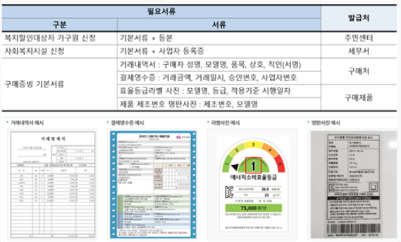 한전 전기요금 복지할인가구를 대상으로 에너지복지 확대를 위해 고효율 가전제품 구입시 구매비용의 10%(가구당 30만원 한도)를 지원해주는 사업입니다.