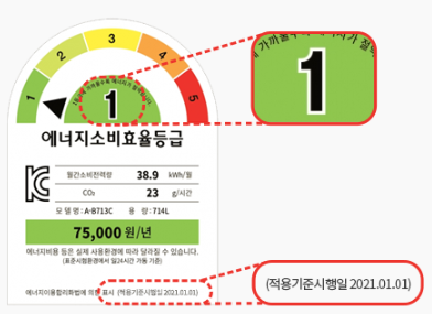 - 반드시 에너지소비효율등급 라벨사진의 『등급』과 『적용기준 시행일』확인