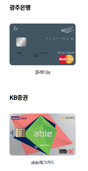 비씨카드, 국민카드, LH농협카드, 현대카드, KEB하나카드, 씨티카드, 삼성카드, 롯데카드 및 전북은행, 광주은행, KB증권 카드 중 제휴되는 카드가 있으며, 정확한 것은 사전에 문의해 보시기 바랍니다.