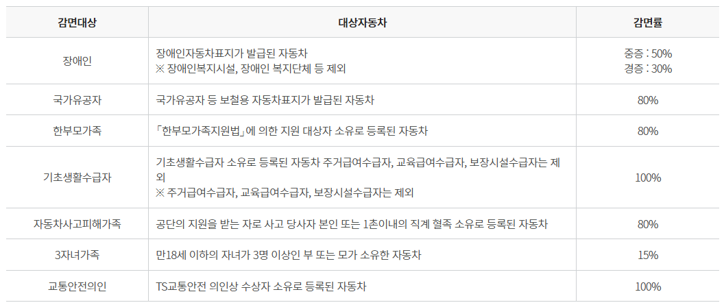 자동차 검사비용을 할인받는 대상자와 감면률은 다음과 같습니다.
