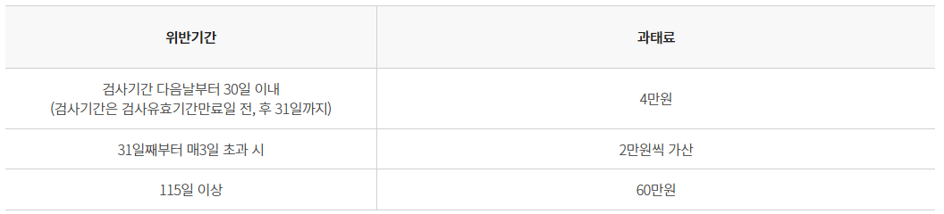 자동차검사를 기간내에 받지 않을 경우 과태료는 다음과 같습니다. 최대 60만원까지 과태료가 늘어날 수 있습니다.