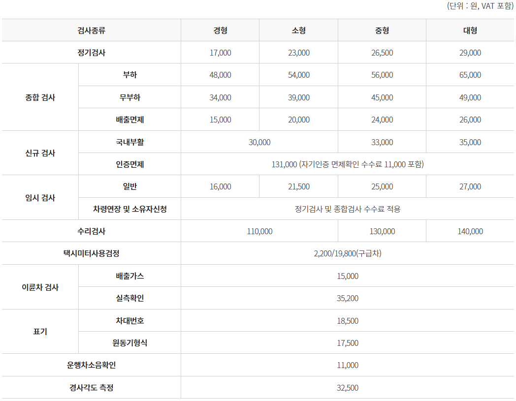 자동차 정기검사 비용은 다음과 같습니다. 아래의 검사수수료는 한국교통안전공단 기준 금액입니다. 민간 지정정비사업자는 공단과 다소 차이가 있습니다. 예를 들어, 최근 중형차의 종합검사를 받을 때, 아래 표에서는 56,000원이지만 민간 지정정비사업자에서는 60,000원의 검사료를 지불한 경험이 있습니다.