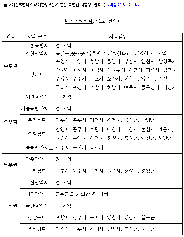 대기환경보전법 제63조 제1항 제1호의 대기관리권역은 아래 표를 참고하시기 바랍니다.