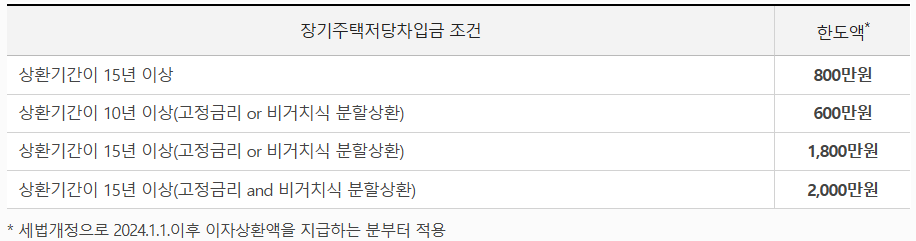 - 단, 장기주택저당차입금 이자상환액 공제금액 + 주택임차차입금 원리금상환 공제금액 + 주택마련저축 공제금액의 합계액이 아래 금액까지만 소득공제 가능