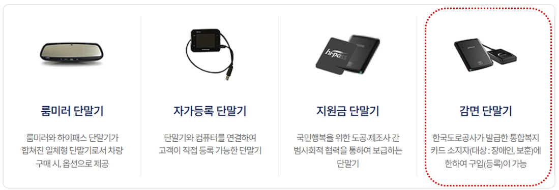 과거에는 장애인과 유공자 등이 하이패스 차로에서 고속도로 통행료 감면을 받기 위해서는 무조건 지문 인식기가 별도로 설치된 감면 하이패스 단말기를 구매해야 했었습니다. (휴먼케어)