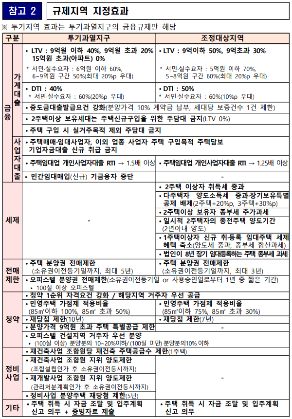 규제지역으로 지정되면 다음과 같은 규제 효과가 발생합니다. 따라서, 이번에 투기과열지구 또는 조정대상지역에서 해제된 경우, 이러한 규제 효과가 없어진다고 보면 되겠습니다.