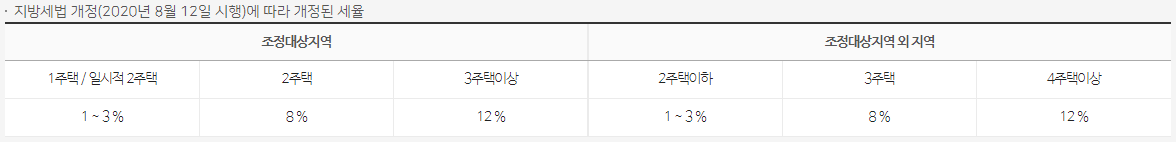 * 예) 두번째 주택으로 5억원의 주택 매입시, 조정대상지역에서는 8.4%인 42,000,000원의 취득세 및 지방교육세를 납부해야 하며, 비조정대상지역에서는 1.1%인 5,500,000원의 취득세 및 지방교육세를 납부하면 됩니다.(약 36.5백만원 차이)